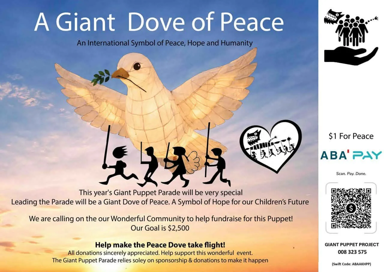 Leading the parade is the Giant Peace Dove - an international symbol of peace, hope, and humanity. A powerful symbol of hope for our childrens future.
