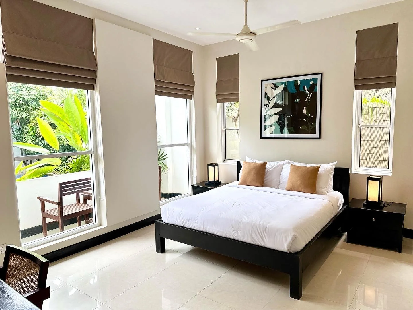 A modern hotel room with a white bed, beige pillows, black nightstands with lamps on each side, artwork above the bed, multiple windows with brown blinds, and a small balcony with a wooden chair and lush green plants outside.