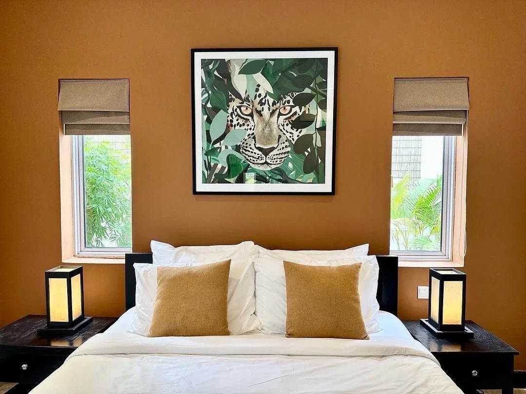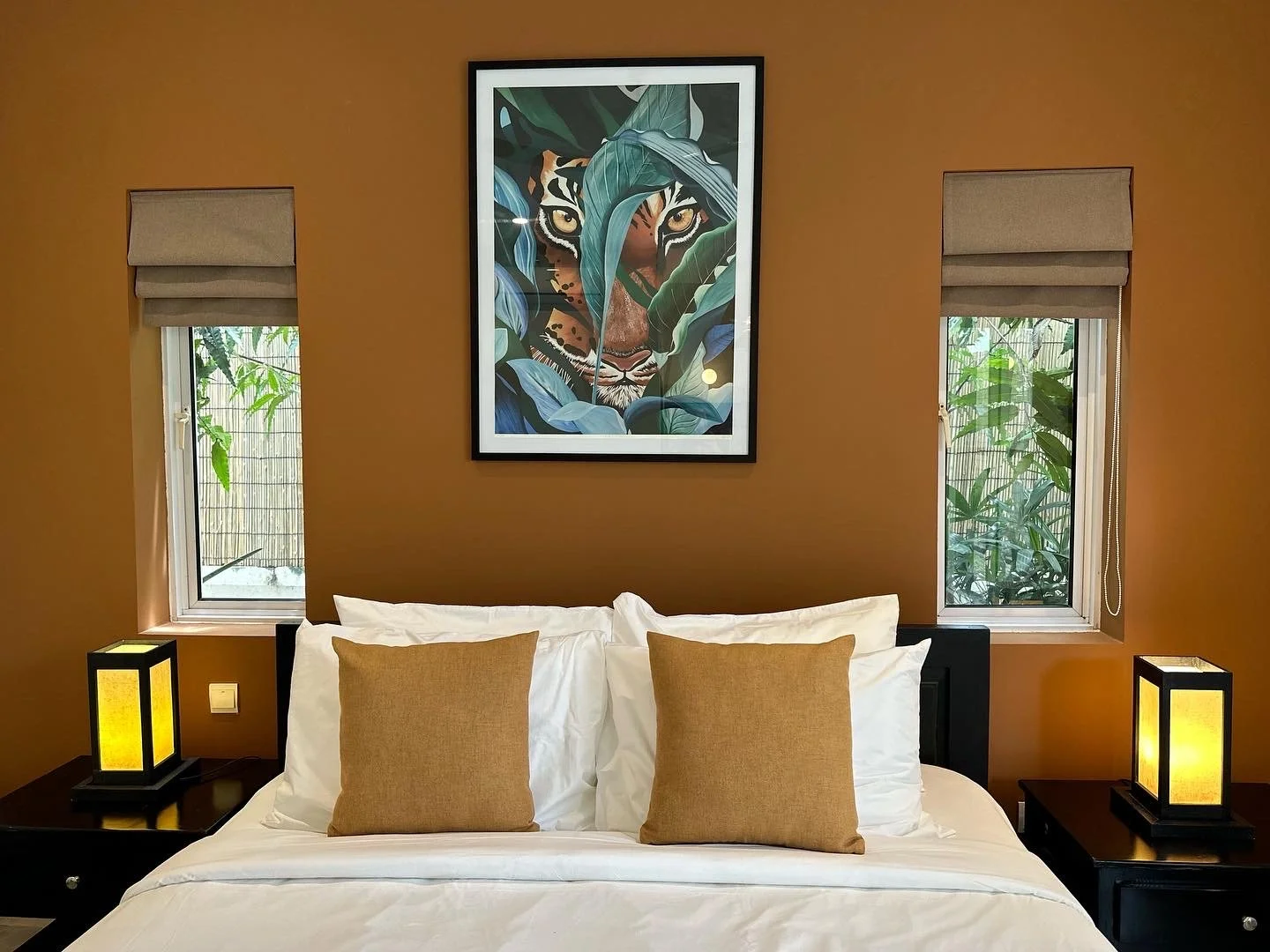 A bedroom with a bed, two beige pillows, two nightstands with yellow lamps, two windows with blinds, and a framed artwork of a tiger surrounded by leaves on a brown wall.