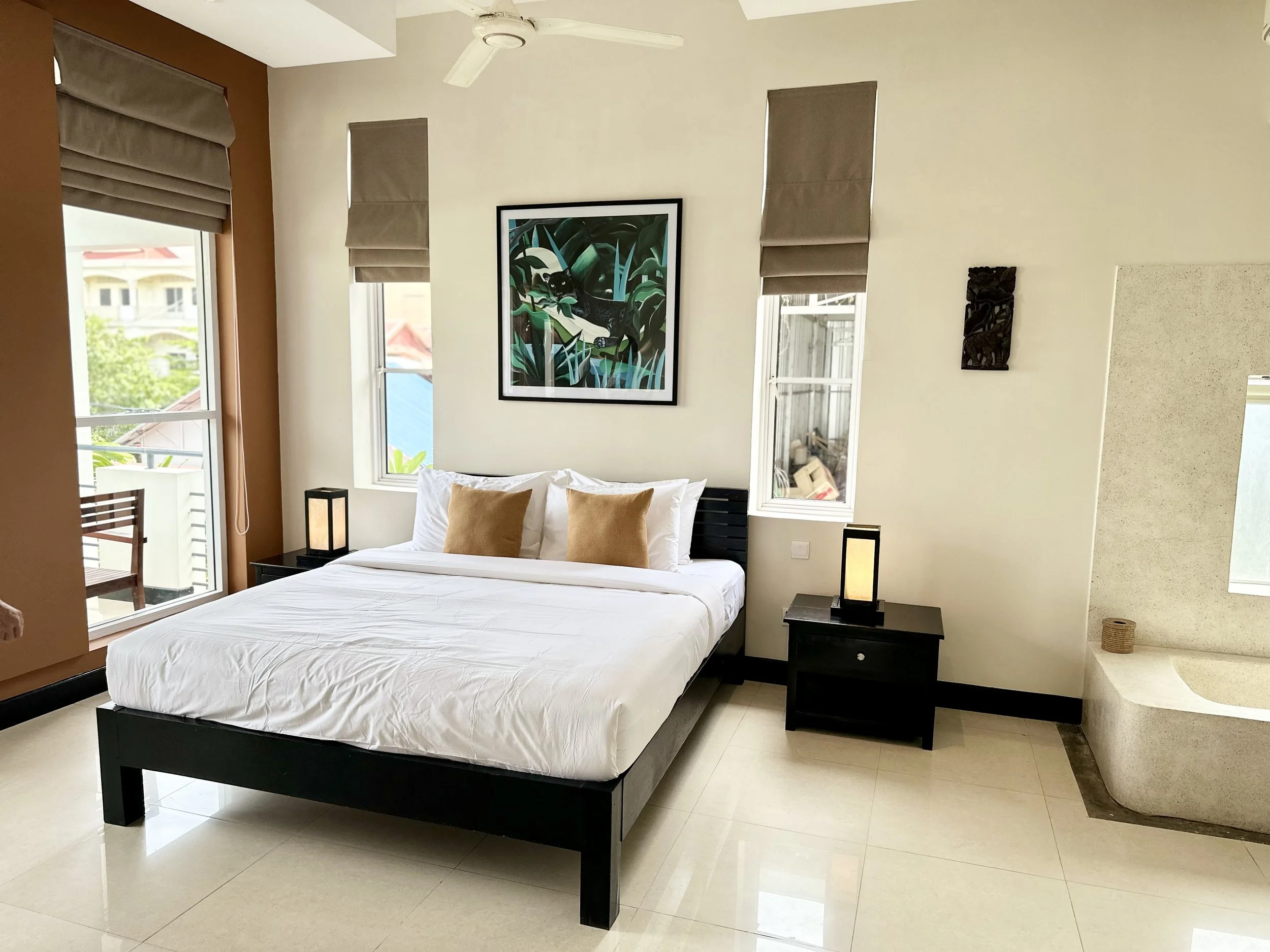 Modern bedroom with a large bed, two windows with brown blinds, a ceiling fan, a black nightstand with lamps on both sides, and a small sitting area near a window with natural light.