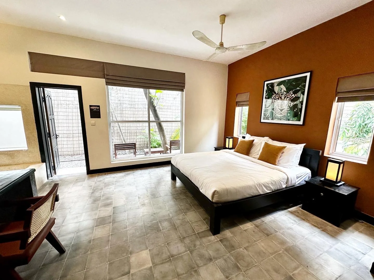 Hotel room with a large bed with white bedding and brown pillows, two nightstands with lamps, a framed artwork of a tiger above the bed, windows with blinds, a ceiling fan, and a door leading outside to a small patio with a bench, greenery, and a tre