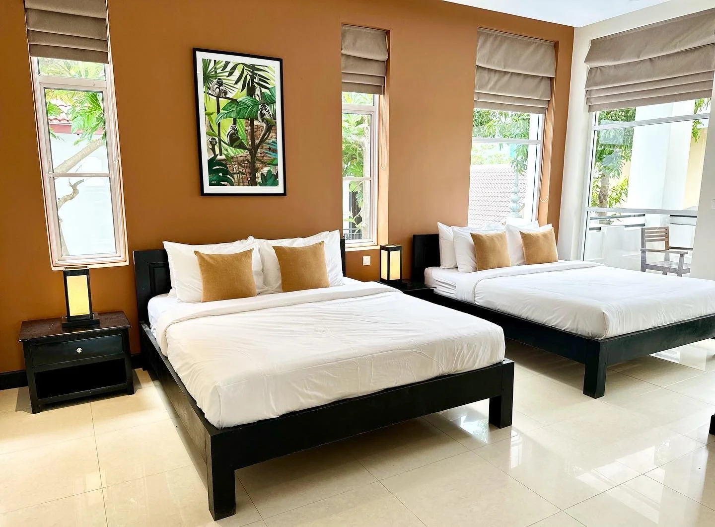 Room with two large beds, each with white linens and beige pillows, black bedside tables with lamps, windows with blinds, and a balcony with outdoor seating. An artwork depicting tropical foliage hangs on a brown accent wall.