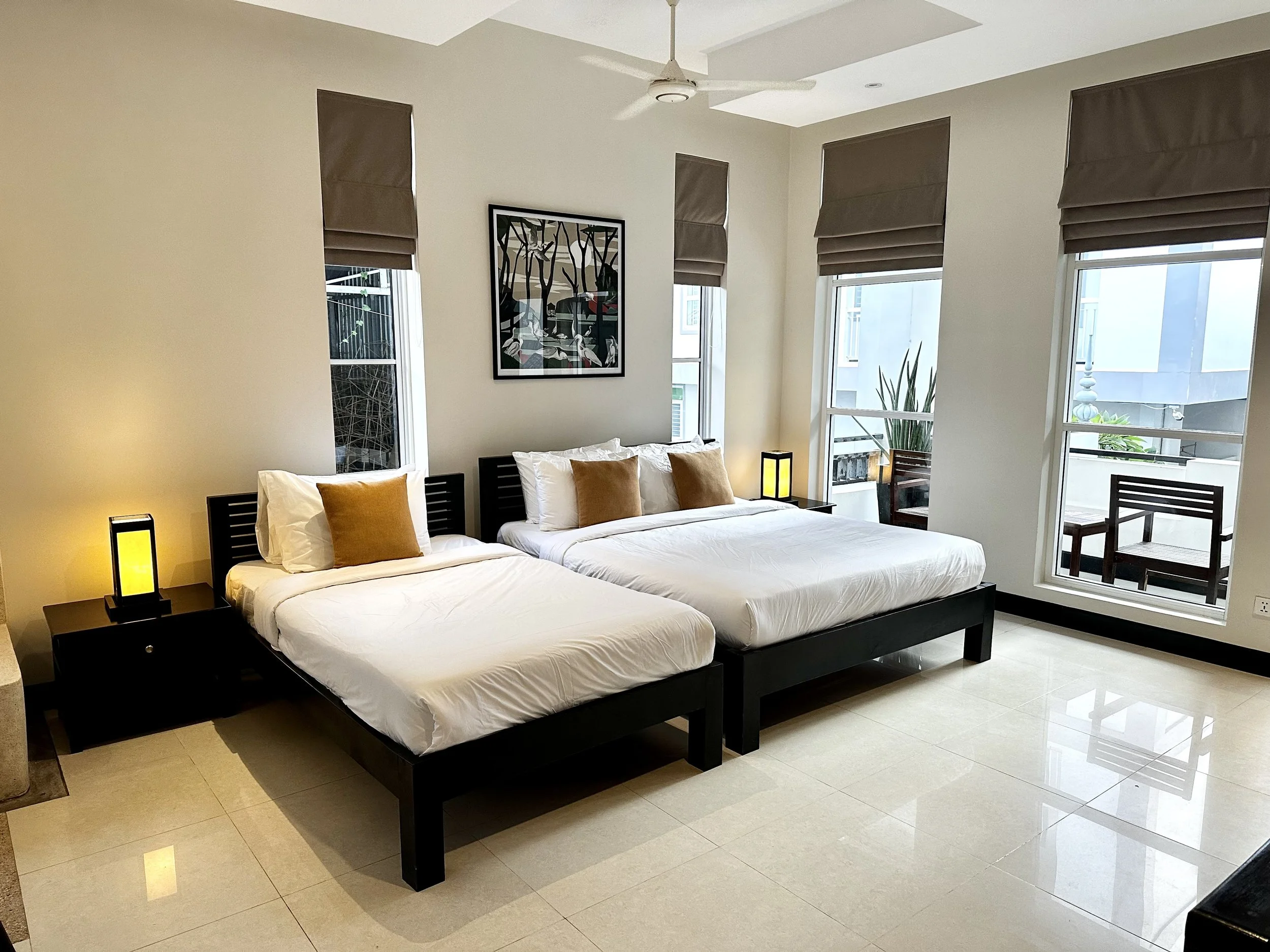 A modern hotel room with two beds, each with white bedding and brown accent pillows. There are three large windows with brown blinds, a ceiling fan, a black bedside table with a yellow lamp, a painting on the wall, and a small balcony with chairs out