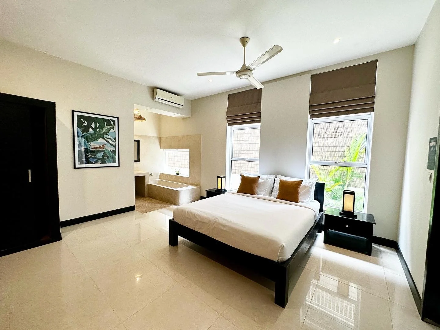Modern bedroom with a large bed, gold pillows, nightstands with lamps, framed artwork above the bed, windows with brown blinds, a ceiling fan, and a tiled floor.